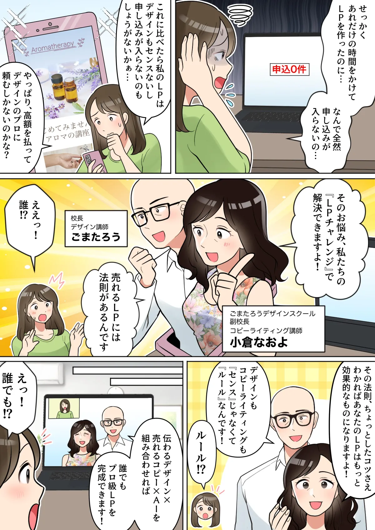 2024年7月、夫婦でノンデザイナーのための「ごまたろうデザインスクール」を開校。センスがなくても「売れるデザイン力」が身につく講義や、的確だけど誰も傷つかないフィードバック、素人デザインが短時間でプロの仕上がりになる即興のライブ添削が好評。